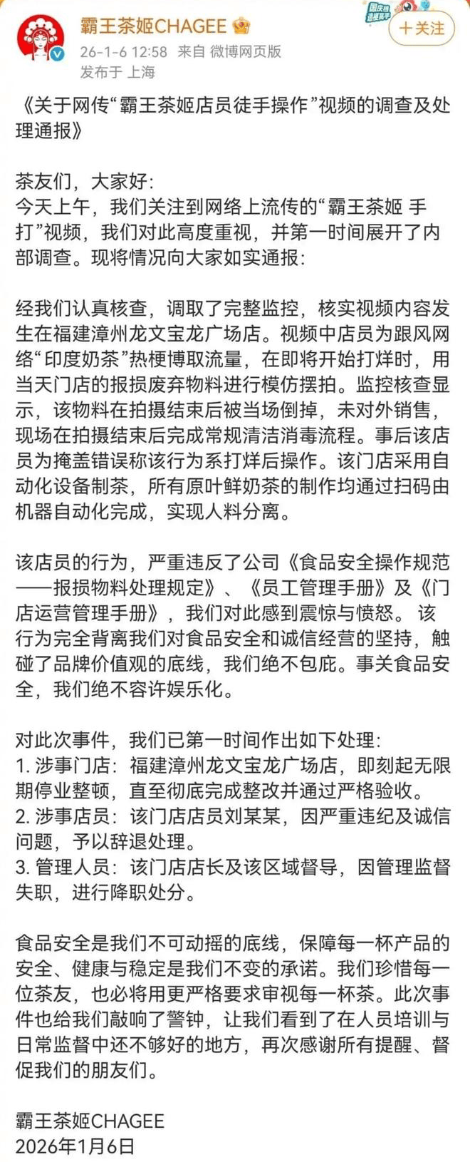 女伙计所正在的涉事品牌霸王别姬发布传递,终究奶茶属于食物,被降职处分。平安和卫生问题近年来一曲备受关心,引来不少网友关心和热议,半夜时分,店长及区域督导也因而遭到,她一共有23个做品,本人被视频的热度“吓醒”了。
